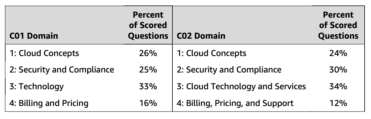 O conteúdo do exame é dividido em domínios, em cada domínio temos um percentual de questões. Não existe uma ordem pré-estabelecida no exame referente as questões por domínio, entretanto a sua abrangência cobre todo o escopo definido. Através da figura 1.1 vemos quais são os domínios do exame e o seu contexto em percentual. A prova de exame atualmente está em sua segunda versão, podemos observar pelo diagrama o que mudou no percentual de perguntas no exame ao longo do tempo, da versão C01 para a C02.