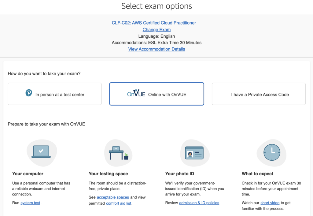 Já a segunda opção é a realização do exame no conforto da sua casa, através do formato de online proctoring, onde ao realizar o agendamento do exame, selecionamos qual é o idioma da prova, e o idioma que iremos nos comunicar de forma online com o avaliador do exame. Geralmente esta etapa é bem tranquila, uma pessoa irá fazer algumas perguntas simples em inglês antes de iniciar o exame, entretanto devemos garantir alguns pontos: